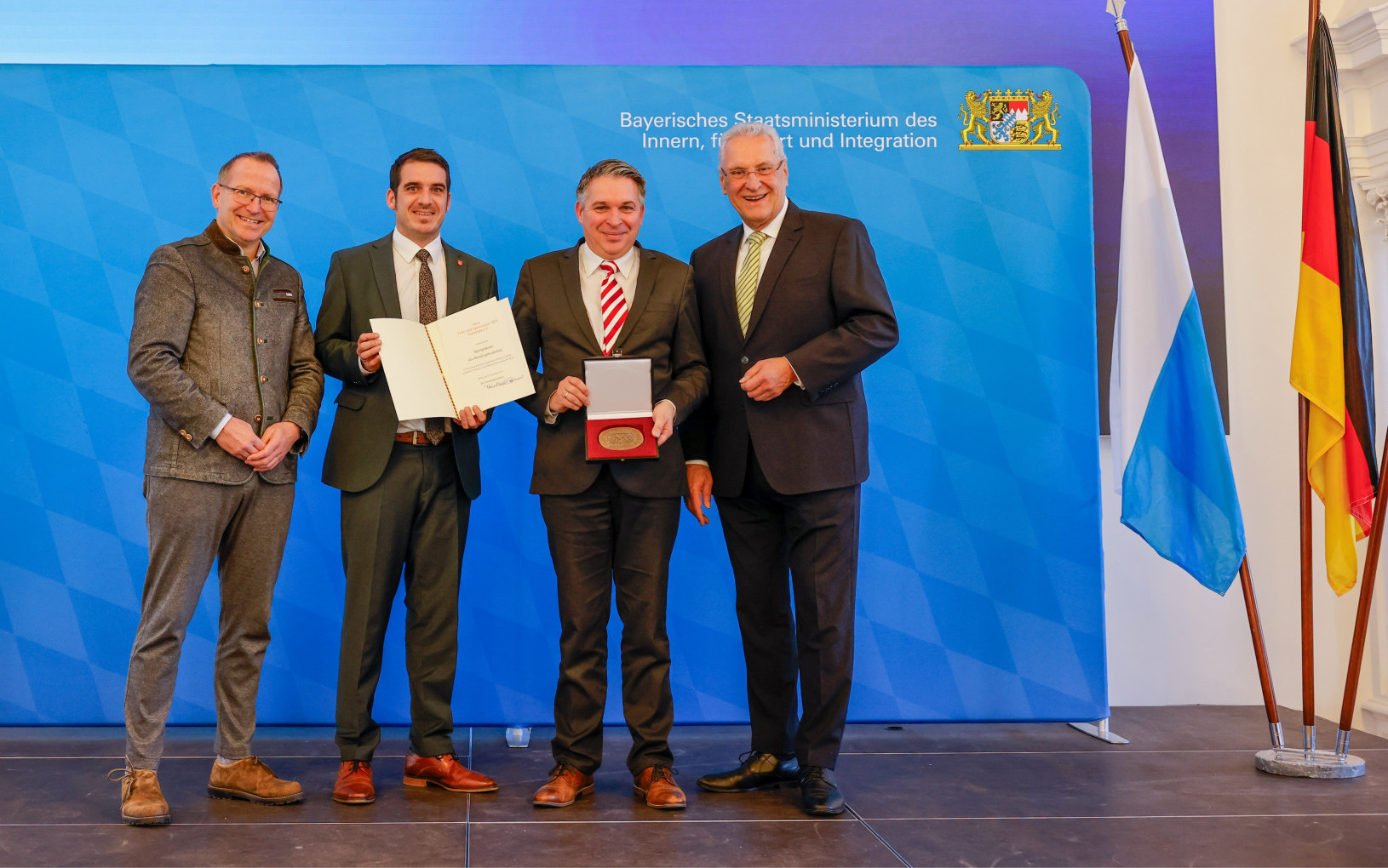 Innen- und Sportminister Dr. Joachim Herrmann (rechts) und BLSV-Präsident Jörg Ammon (links) überreichen die Sportplakette an TSV-Vorsitzenden Carsten Höllein (Zweiter von rechts) und Seßlachs Bürgermeister Maximilian Neeb.